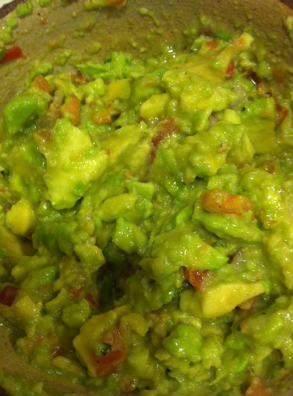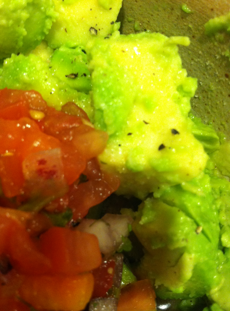 8. Last add 2-3 heaping spoonfuls of the salsa fresca to the mixture and lightly mix. This adds the exact freshness that the guacamole needs to not be bland. I love that Whole Foods prepares it and has it on ice in the prepared foods section. I would hate to have to cut up all those tomatoes and onions.