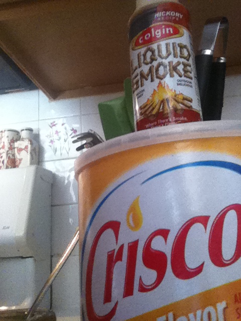 • Place extra large sauce pan or dutch oven on medium low heat with crisco, liquid smoke, and at least 1-2tablespoons salt.