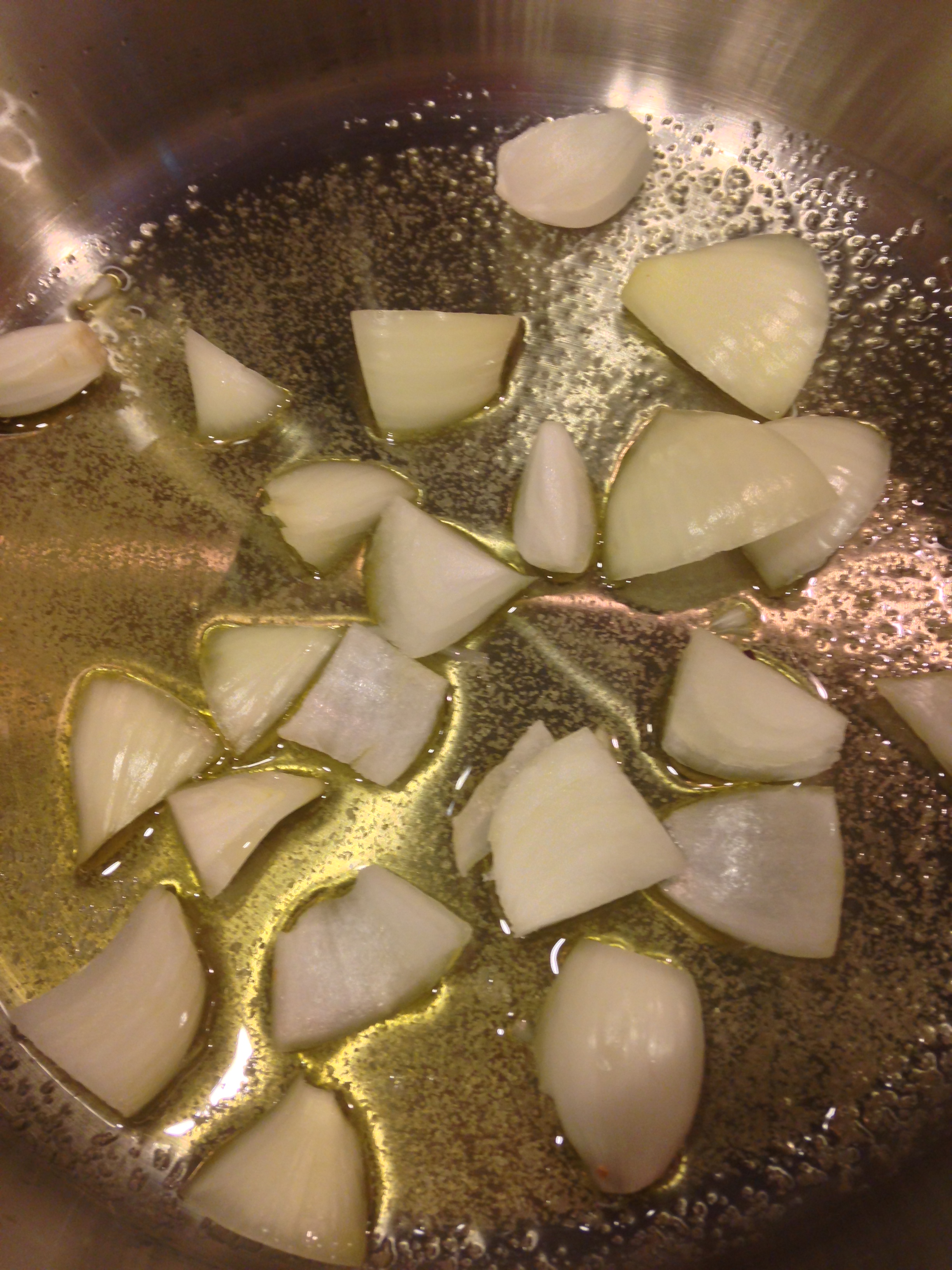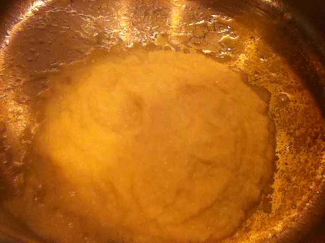 First you need to cook down and puree the onions. Just place chopped onions in a pan with Crisco and a few pinches of salt and cook down until translucent. Then puree with a hand blender or food processor. Place to the side.