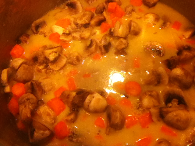 • Last, after another 30 minutes. Remove 1-2 cups of the broth, a few carrots, mushrooms, and potatoes and place in a small sauce pan (my immersion blender has a little pot to puree in so I use that). Add 1/2cup of flour and make a paste with an immersion blender.