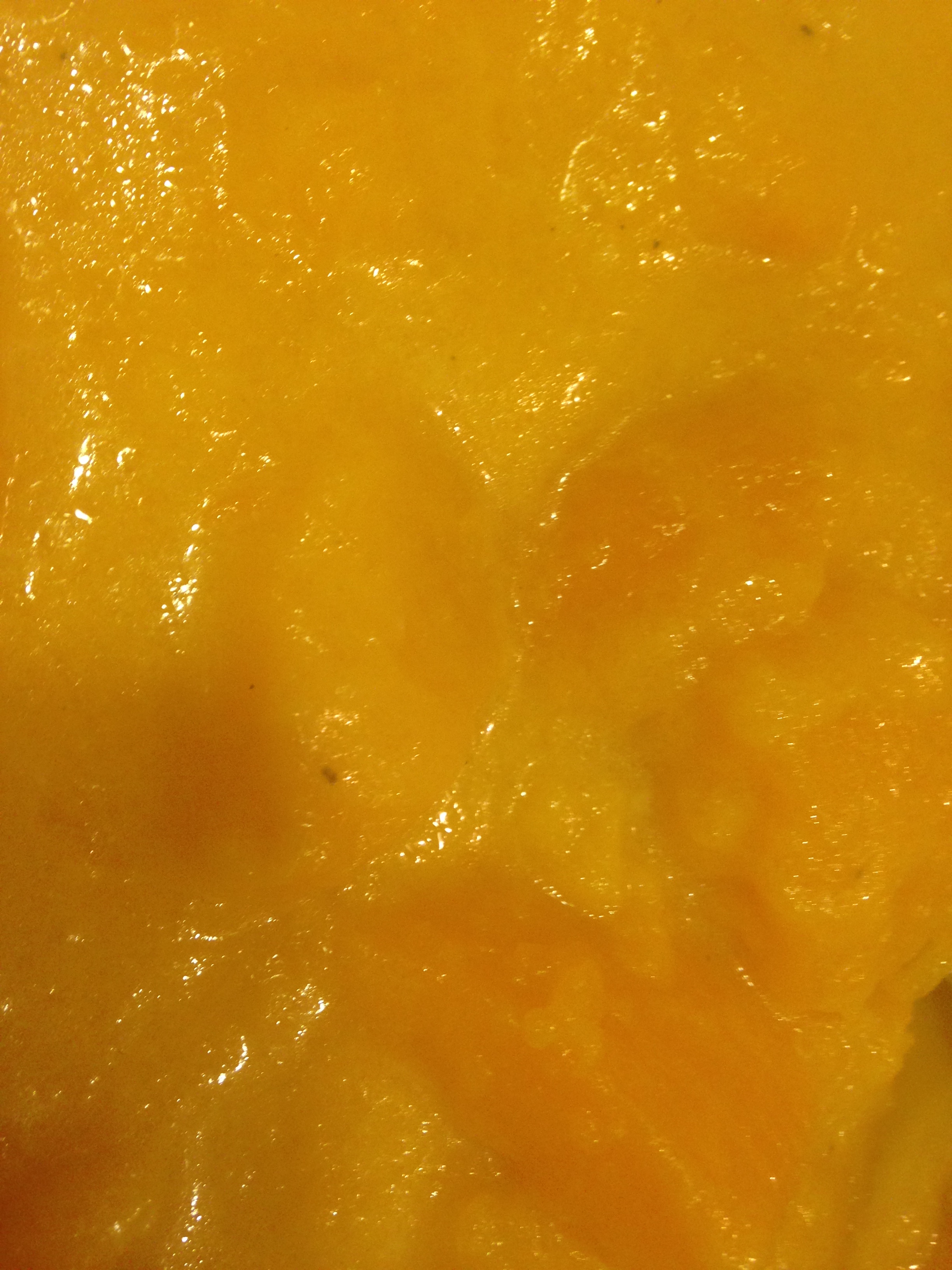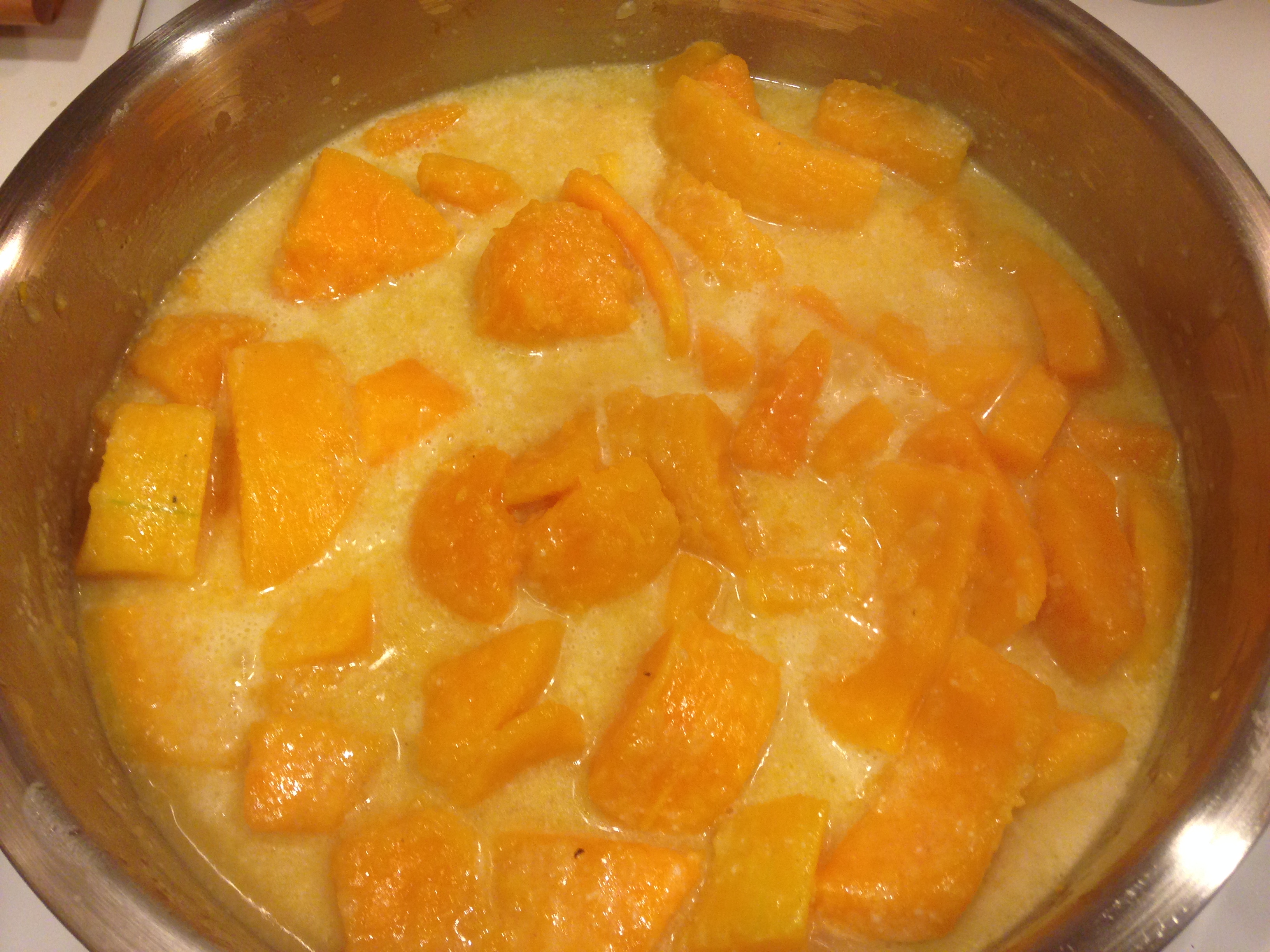 When the sweet potatoes were roasted, I peeled them and tossed them in the Vitamix with 2 tablespoons maple syrup, 2 tablespoons curry spice (yellow), 1 tablespoon coconut oil, and 1 cup apple cider and pureed the mixture. It was very thick.