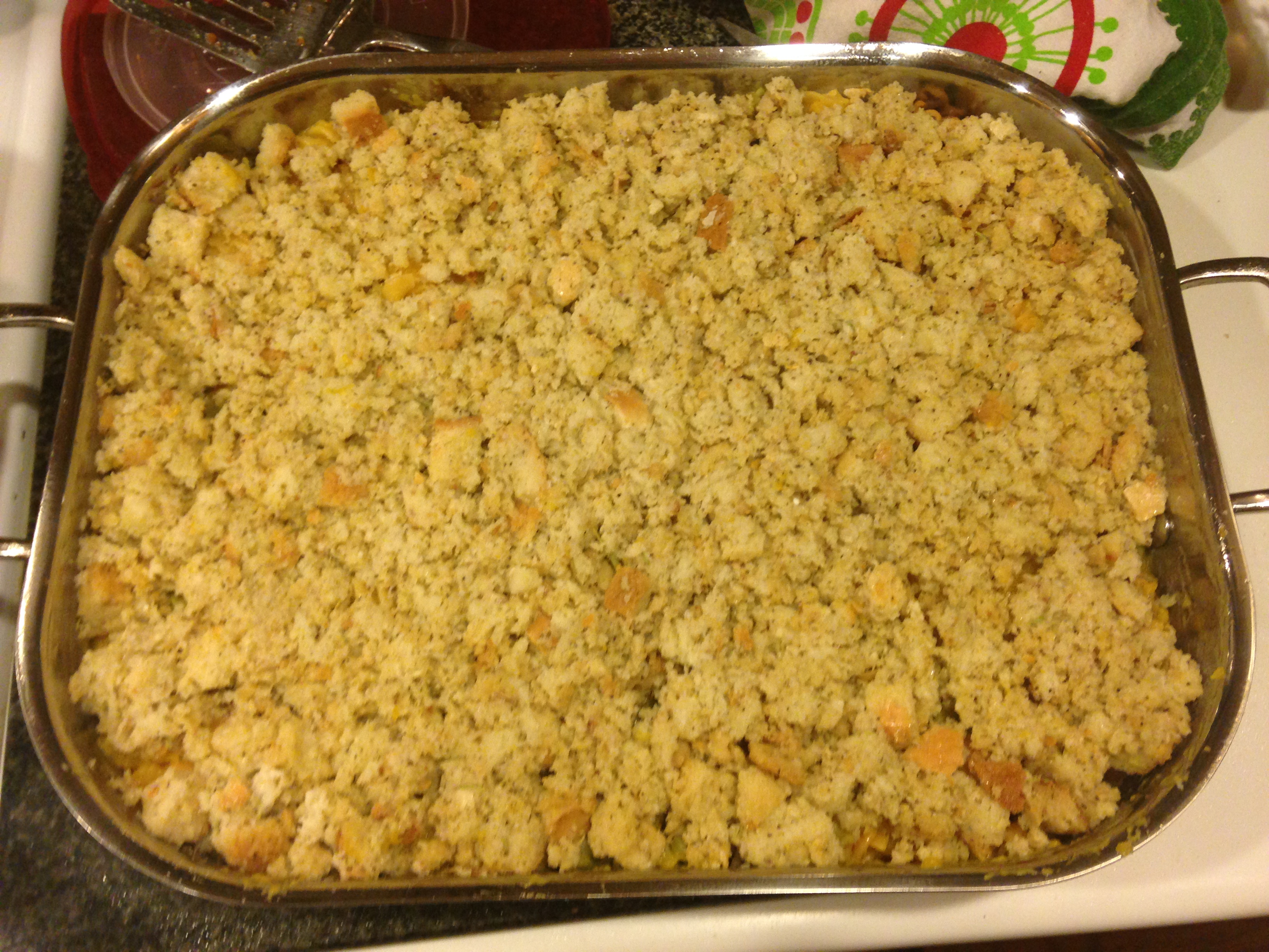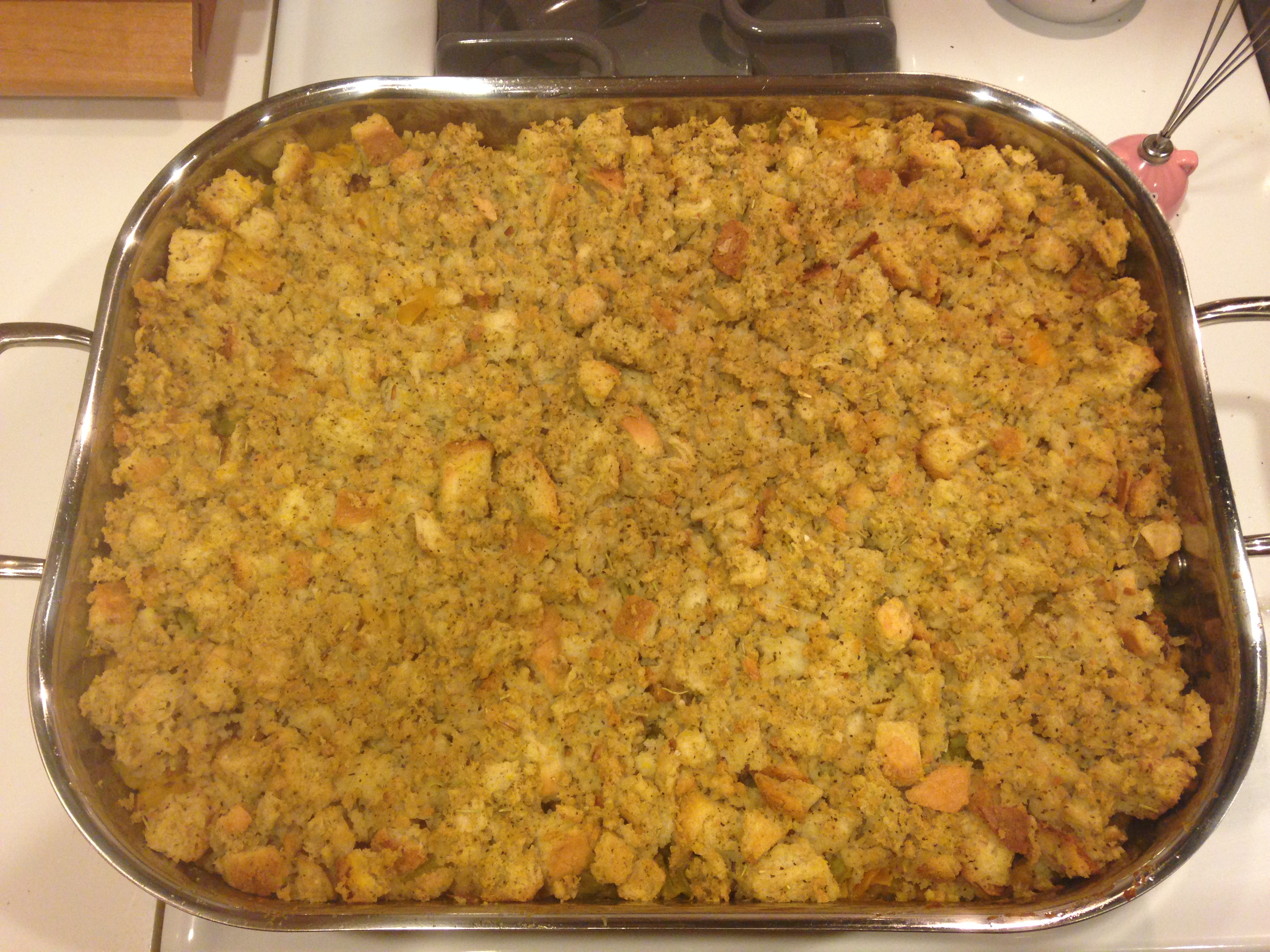 I must say that I am in LOVE with the onion foccacia bread that is prepared at Whole Foods. I buy it all the time. I use it in my recipe for chicken pot pie. It is borderline amazing for any purpose. I just adore it. That being said I thought to myself after the holidays were over, “Wow I ate a lot of stuffing but I didn’t stuff it INTO anything”. Then I turned that on it’s head and wondered why not stuff a bread instead of stuff an animal. It is obviously healthier and less gross so let’s give it a whirl. Out came an amazing and delicious treat I have even served my guy friends at a recent dinner with a side of pumpkin curry soup. Enjoy! (they definitely did).