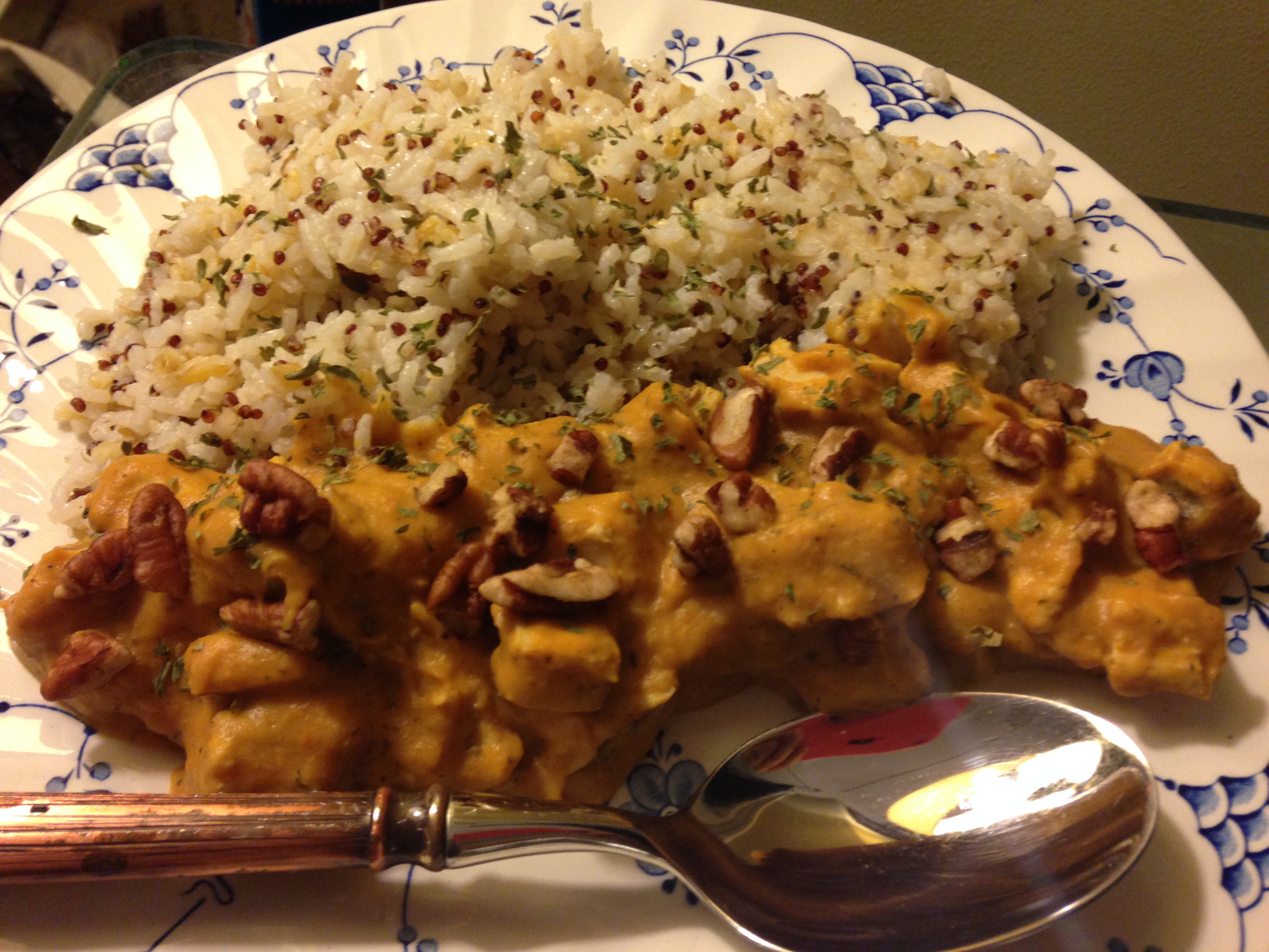When you are a kid in any part of the world it seems like “chicken and rice” is a staple type of food. How those components are dressed is different depending on time of year, climate, and culture but all those aside we can all agree we kinda love the simplicity of this dish. It is fall and I had a few friends show up unexpectedly at my house last night. I literally had NO idea they were coming with their two kids and fairly large German shepherd – coyote mix (Ryder) who is my tiny 9 lb rat terrier – chihuahua mix’s (Lola) best friend (I know it’s odd but adorable. Pics of Lola are posted below). That being said I had to make up food in a snap for an all omnivore crowd with one child that is citrus and citric acid intolerant. That means no tomatoes or lemon or orange or lime. Which, oddly, I use quite a bit. So I figured a nice chicken and rice dish with a pumpkin cream sauce sounded easy enough. I grabbed my steamer and away we went. I steamed Rice Select Royal Blend with Red Quinoa on the brown rice setting of my steamer/rice cooker with water salt and earth balance per the cartons instructions and then went off to make my pumpkin sauce.