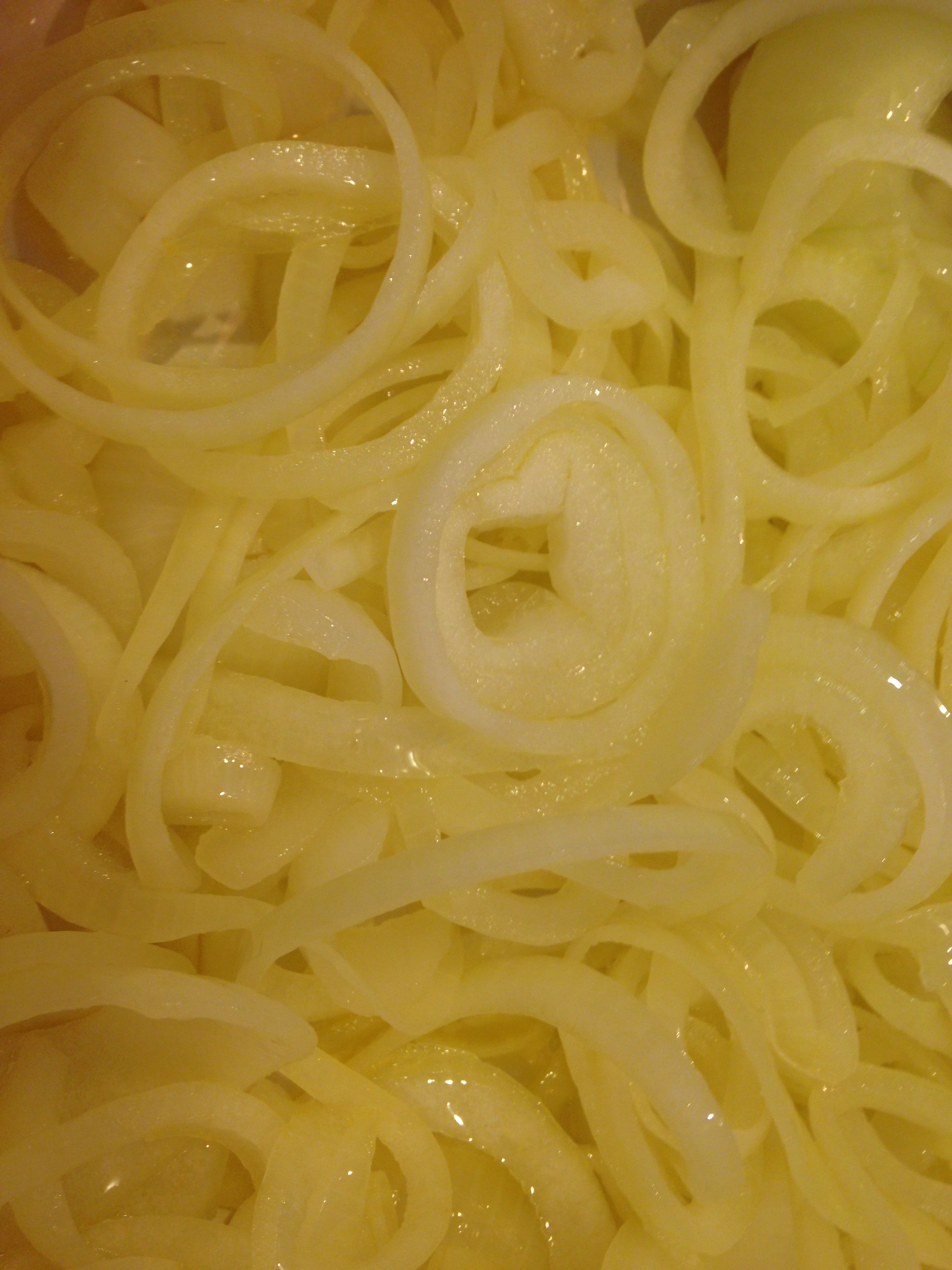 • Once the crisco melts at onions and stir onion, oil, salt, smoke misture until onions are golden.